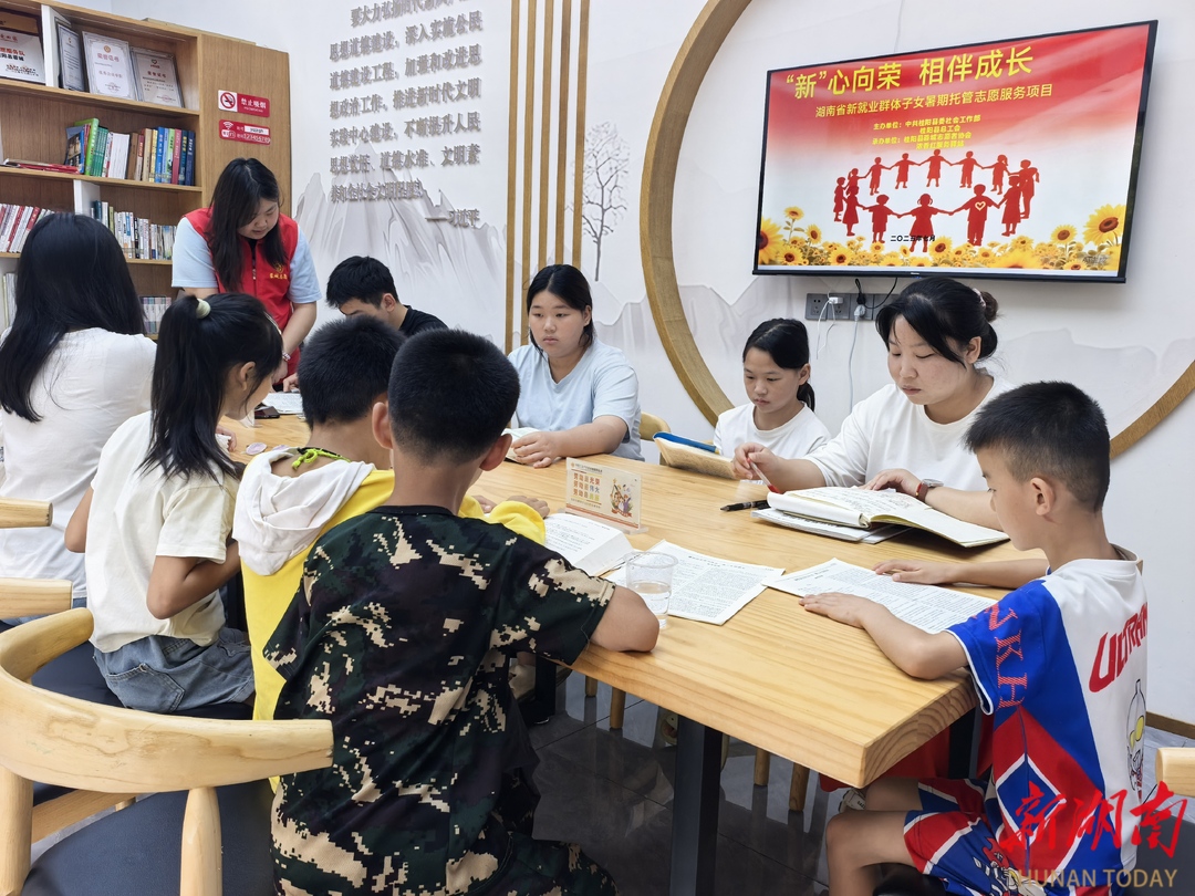 8月5日,桂阳县志愿者正在对该县部分新就业形态劳动者子女进行作业辅导。今年暑假,省委社会工作部统筹实施“‘新’心向荣 相伴成长”新就业群体子女暑期托管志愿服务项目,让各地新就业群体子女从“脱管”变“托管”,让家长得以安心工作。通讯员 史纯华 摄