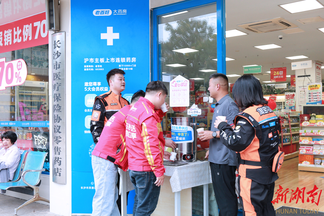 10月20日,老百姓大药房长沙万家丽店的“爱心驿站”标识格外醒目,上面写着“免费使用微波炉、休息座椅,免费茶水、手机应急充电,免费自测体温/血压”,不时有外卖小哥等新就业形态劳动者进来歇脚、喝水。通讯员 摄